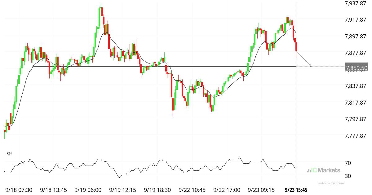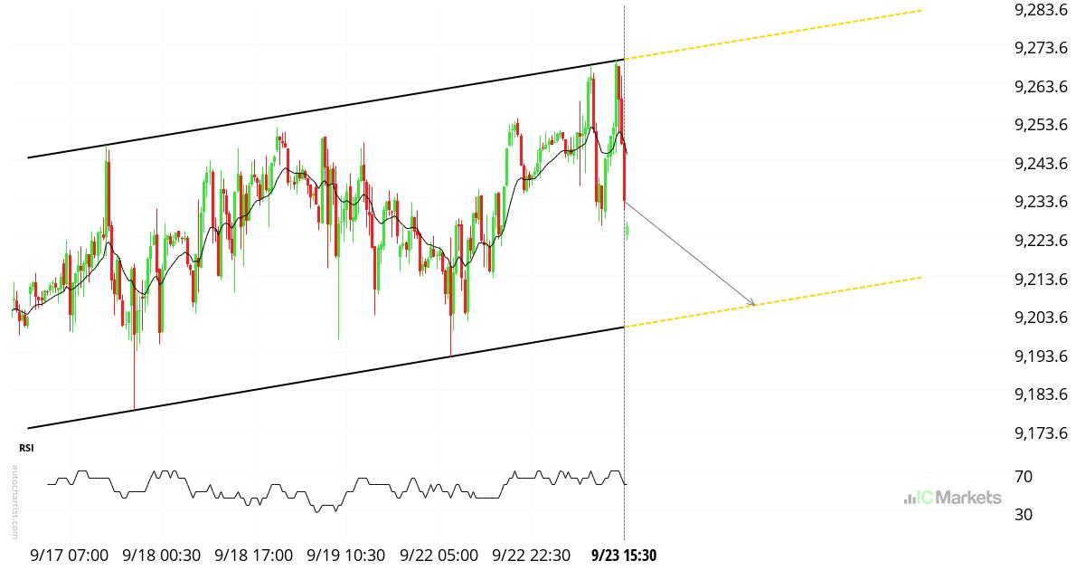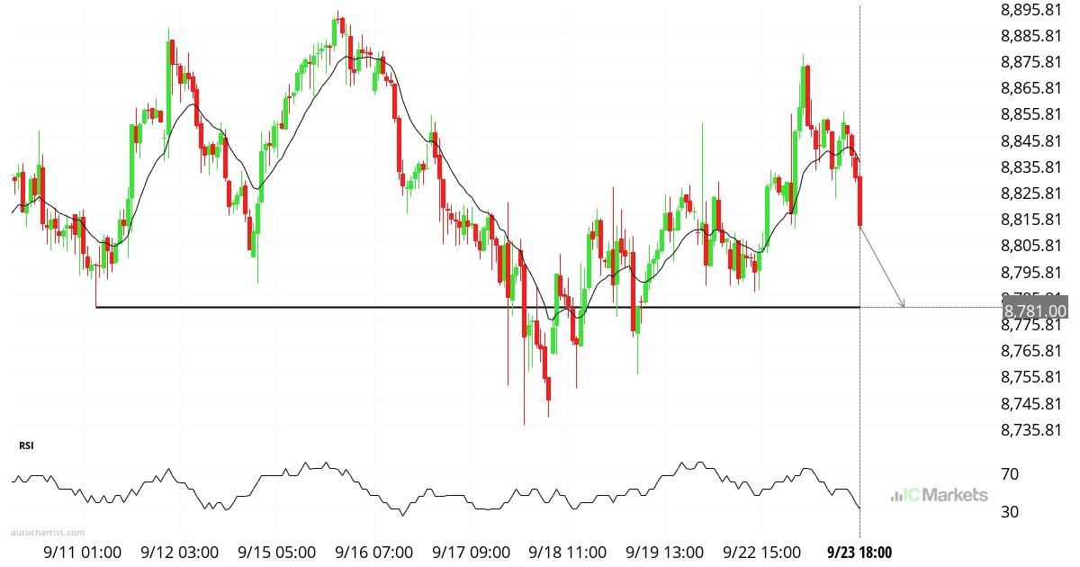 يقترب من مستوى الدعم عند 8,781.00 المحدد في 9/23 18:00. لا يزال هذا النمط قيد التشكّل. توقعات بحركة سعرية هبوطية محتملة نحو مستوى الدعم 8,781.00 خلال الـ 1 يوم القادمة. تحذير من المخاطر: ينطوي التداول في الأوراق المالية على مخاطر كبيرة. قد تتقلب الأسعار وقد تفقد الأوراق المالية قيمتها بالكامل. قد تتجاوز الخسائر قيمة الودائع. […]