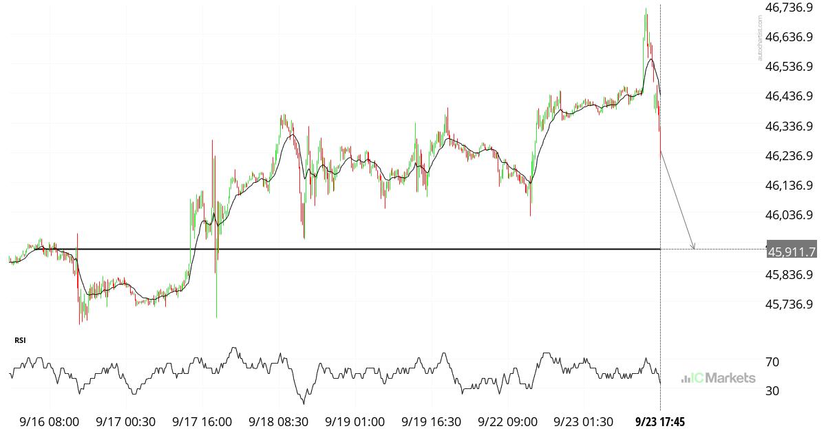 يقترب من مستوى الدعم عند 45,911.7 المحدد في 9/23 17:45. لا يزال هذا النمط قيد التشكّل. توقعات بحركة سعرية هبوطية محتملة نحو مستوى الدعم 45,911.7 خلال الـ 1 يوم القادمة. تحذير من المخاطر: ينطوي التداول في الأوراق المالية على مخاطر كبيرة. قد تتقلب الأسعار وقد تفقد الأوراق المالية قيمتها بالكامل. قد تتجاوز الخسائر قيمة الودائع. […]