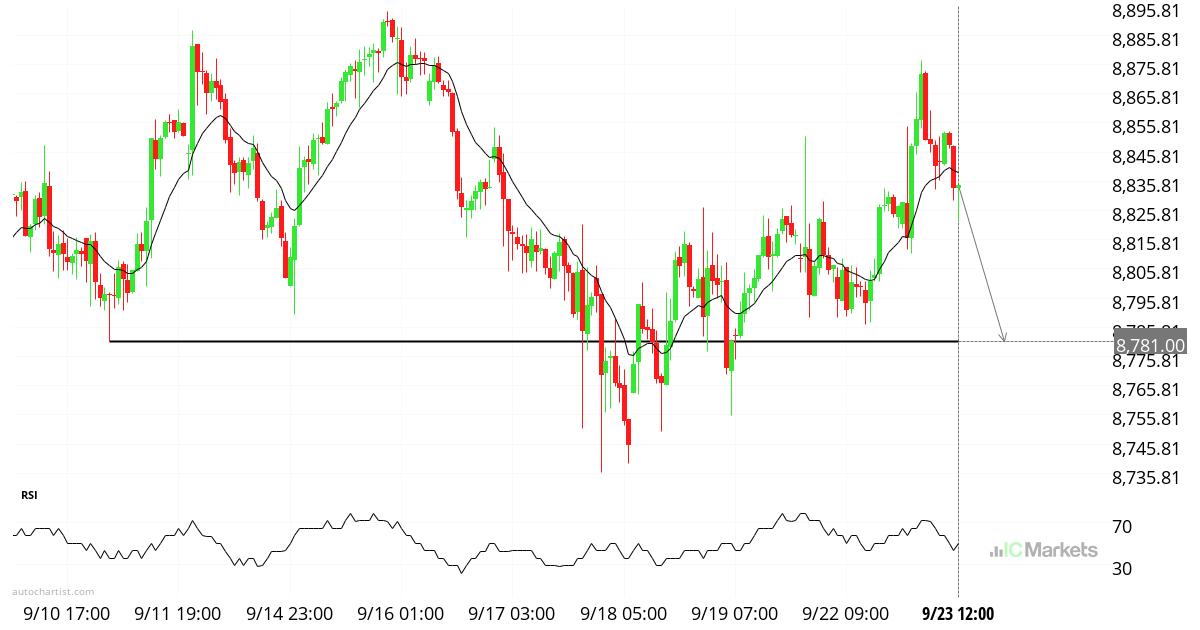 يقترب من مستوى الدعم عند 8,781.00 المحدد في 9/23 12:00. لا يزال هذا النمط قيد التشكّل. توقعات بحركة سعرية هبوطية محتملة نحو مستوى الدعم 8,781.00 خلال الـ 1 يوم القادمة. تحذير من المخاطر: ينطوي التداول في الأوراق المالية على مخاطر كبيرة. قد تتقلب الأسعار وقد تفقد الأوراق المالية قيمتها بالكامل. قد تتجاوز الخسائر قيمة الودائع. […]