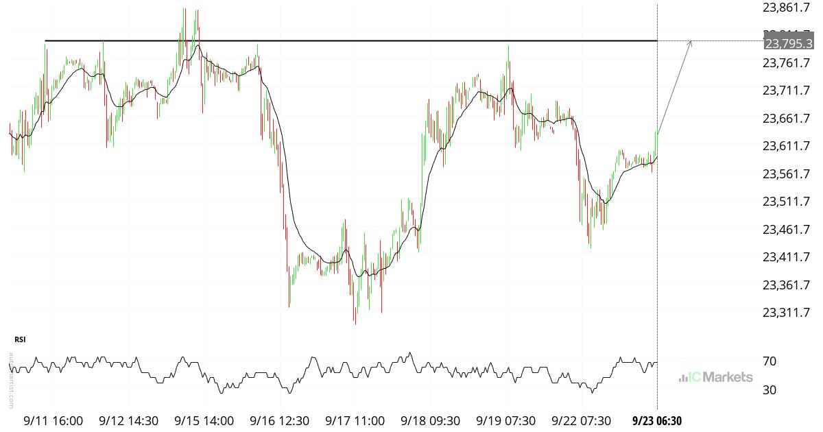 กำลังเคลื่อนไปที่ระดับ แนวต้าน ของ 23,795.3 ตรวจพบที่ 9/23 06:30 รูปแบบนี้กำลังอยู่ระหว่างการฟอร์มตัว มีโอกาสเกิดการเคลื่อนตัวของราคาแบบ bullish ไปยังแนวต้าน 23,795.3 ภายใน 1 วัน ต่อจากนี้ การซื้อขายหลักทรัพย์มีความเสี่ยงสูง ราคาหลักทรัพย์อาจมีความผันผวนและอาจสูญเสียมูลค่าได้ นักลงทุนอาจสูญเสียเงินลงทุนเกินกว่าที่ฝากไว้ ผลิตภัณฑ์เหล่านี้มีความซับซ้อนและต้องใช้ความรู้ความเข้าใจอย่างเหมาะสมก่อนการลงทุน