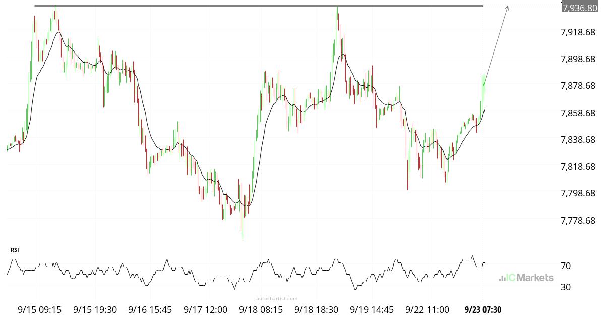กำลังเคลื่อนไปที่ระดับ แนวต้าน ของ 7,936.80 ตรวจพบที่ 9/23 07:30 รูปแบบนี้กำลังอยู่ระหว่างการฟอร์มตัว มีโอกาสเกิดการเคลื่อนตัวของราคาแบบ bullish ไปยังแนวต้าน 7,936.80 ภายใน 20 ชั่วโมง ต่อจากนี้ การซื้อขายหลักทรัพย์มีความเสี่ยงสูง ราคาหลักทรัพย์อาจมีความผันผวนและอาจสูญเสียมูลค่าได้ นักลงทุนอาจสูญเสียเงินลงทุนเกินกว่าที่ฝากไว้ ผลิตภัณฑ์เหล่านี้มีความซับซ้อนและต้องใช้ความรู้ความเข้าใจอย่างเหมาะสมก่อนการลงทุน