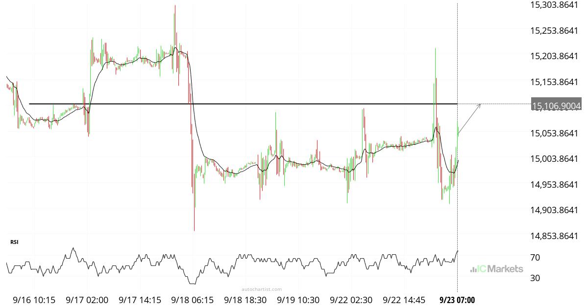 يقترب من مستوى المقاومة عند 15,106.9000 المحدد في 9/23 07:00. لا يزال هذا النمط قيد التشكّل. توقعات بحركة سعرية صعودية محتملة نحو مستوى المقاومة 15,106.9000 خلال الـ 23 ساعات القادمة. تحذير من المخاطر: ينطوي التداول في الأوراق المالية على مخاطر كبيرة. قد تتقلب الأسعار وقد تفقد الأوراق المالية قيمتها بالكامل. قد تتجاوز الخسائر قيمة الودائع. […]