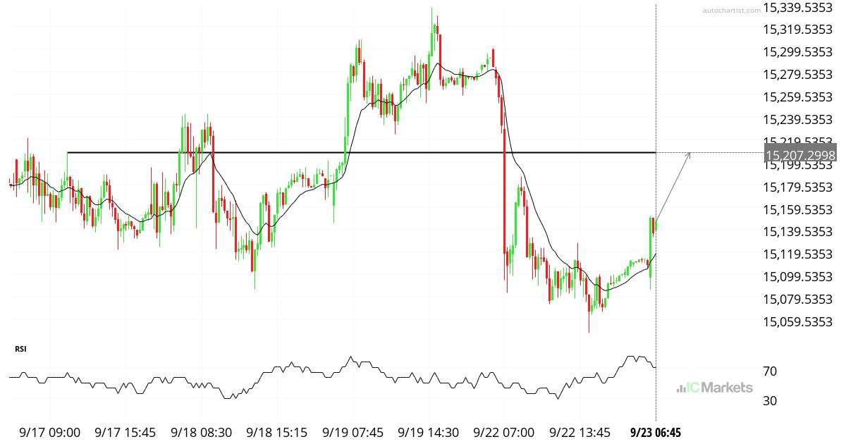 يقترب من مستوى المقاومة عند 15,207.3000 المحدد في 9/23 06:45. لا يزال هذا النمط قيد التشكّل. توقعات بحركة سعرية صعودية محتملة نحو مستوى المقاومة 15,207.3000 خلال الـ 12 ساعات القادمة. تحذير من المخاطر: ينطوي التداول في الأوراق المالية على مخاطر كبيرة. قد تتقلب الأسعار وقد تفقد الأوراق المالية قيمتها بالكامل. قد تتجاوز الخسائر قيمة الودائع. […]