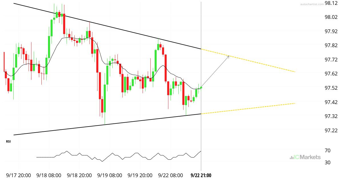 تم تحديد مثلث في 9/22 21:00. لا يزال هذا النمط قيد التشكّل. توقعات بحركة سعرية صعودية محتملة نحو مستوى المقاومة 97.73 خلال الـ 13 ساعات القادمة. تحذير من المخاطر: ينطوي التداول في الأوراق المالية على مخاطر كبيرة. قد تتقلب الأسعار وقد تفقد الأوراق المالية قيمتها بالكامل. قد تتجاوز الخسائر قيمة الودائع. هذه المنتجات معقدة وتتطلب […]