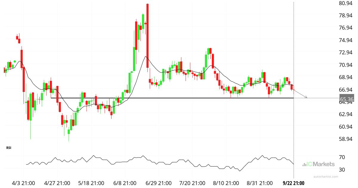 يقترب من مستوى الدعم عند 65.36 المحدد في 9/22 21:00. لا يزال هذا النمط قيد التشكّل. توقعات بحركة سعرية هبوطية محتملة نحو مستوى الدعم 65.36 خلال الـ 25 أيام القادمة. تحذير من المخاطر: ينطوي التداول في الأوراق المالية على مخاطر كبيرة. قد تتقلب الأسعار وقد تفقد الأوراق المالية قيمتها بالكامل. قد تتجاوز الخسائر قيمة الودائع. […]