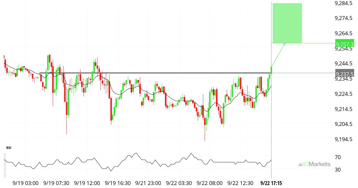 เบรคผ่านระดับ แนวต้าน ของ 9,237.5 ที่ 9/22 17:15 คาดการณ์ว่ามีโอกาสเกิดการเคลื่อนตัวของราคาแบบ bullish ในช่วง 8 ชั่วโมง ต่อจากนี้ไปยัง 9,257.3 การซื้อขายหลักทรัพย์มีความเสี่ยงสูง ราคาหลักทรัพย์อาจมีความผันผวนและอาจสูญเสียมูลค่าได้ นักลงทุนอาจสูญเสียเงินลงทุนเกินกว่าที่ฝากไว้ ผลิตภัณฑ์เหล่านี้มีความซับซ้อนและต้องใช้ความรู้ความเข้าใจอย่างเหมาะสมก่อนการลงทุน