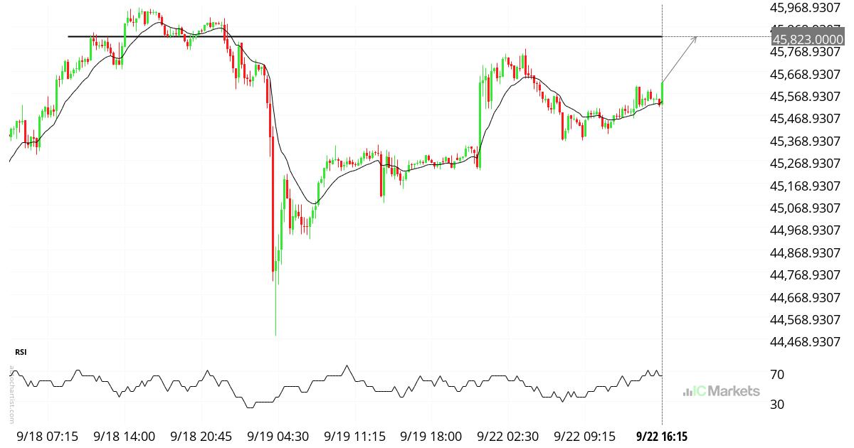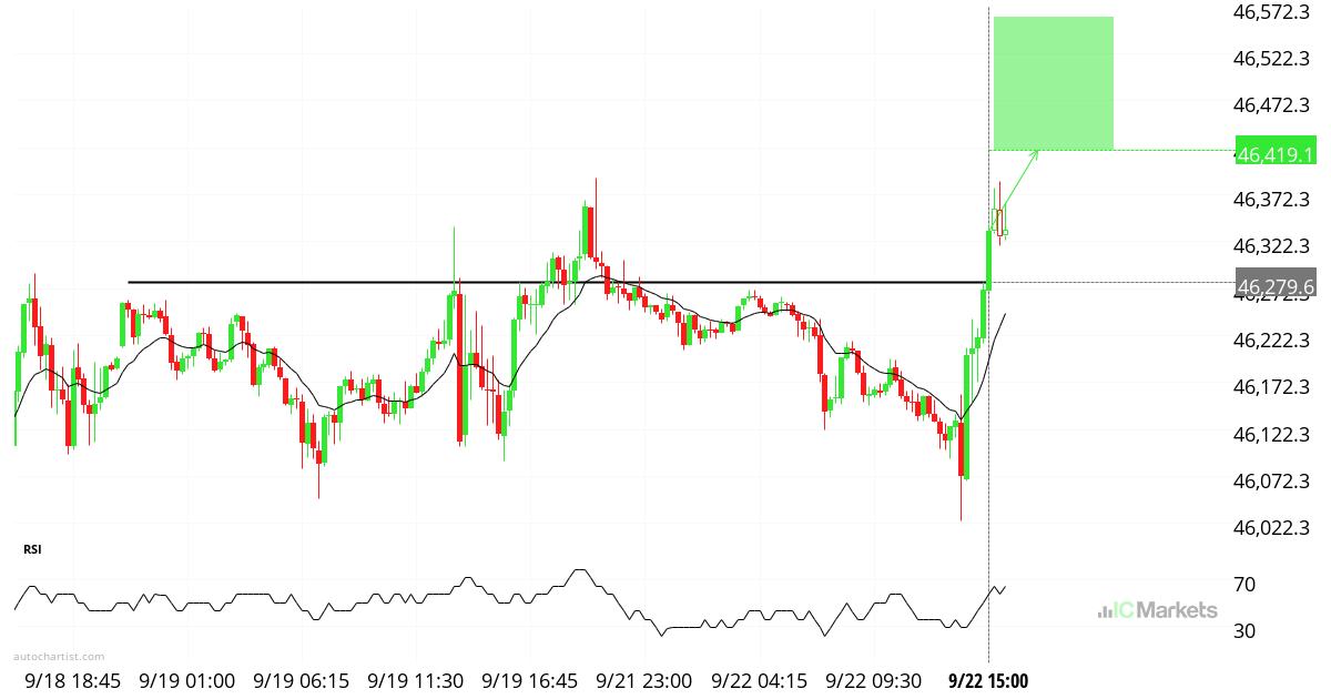 اخترق السعر مستوى المقاومة عند 46,279.6 في 9/22 15:00. توقعات بحركة سعرية صعودية محتملة خلال الـ 9 ساعات القادمة نحو 46,419.1. تحذير من المخاطر: ينطوي التداول في الأوراق المالية على مخاطر كبيرة. قد تتقلب الأسعار وقد تفقد الأوراق المالية قيمتها بالكامل. قد تتجاوز الخسائر قيمة الودائع. هذه المنتجات معقدة وتتطلب معرفة مناسبة.