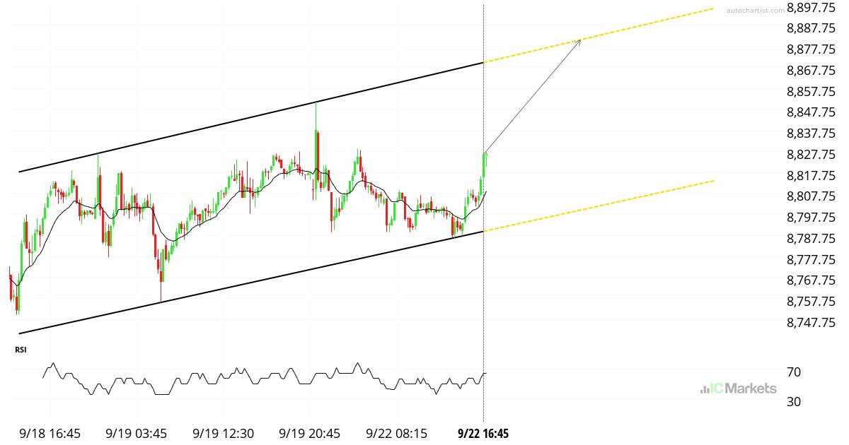 تم تحديد القناة الصاعدة في 9/22 16:45. لا يزال هذا النمط قيد التشكّل. توقعات بحركة سعرية صعودية محتملة نحو مستوى المقاومة 8,880.94 خلال الـ 11 ساعات القادمة. تحذير من المخاطر: ينطوي التداول في الأوراق المالية على مخاطر كبيرة. قد تتقلب الأسعار وقد تفقد الأوراق المالية قيمتها بالكامل. قد تتجاوز الخسائر قيمة الودائع. هذه المنتجات معقدة […]