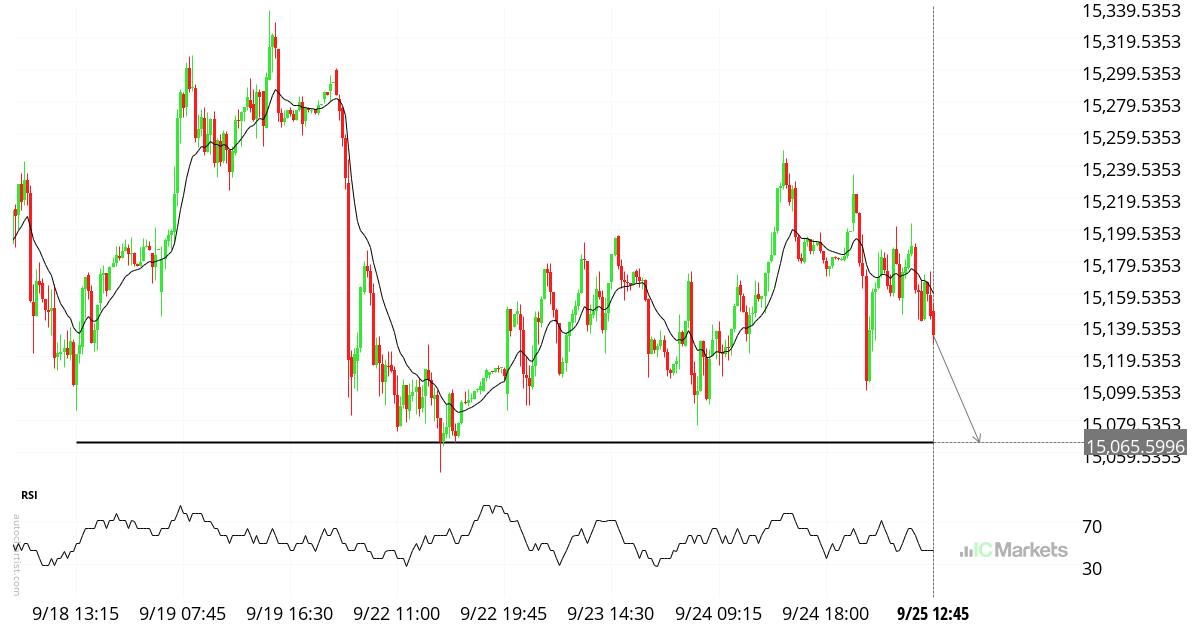 กำลังเคลื่อนไปที่ระดับ แนวรับ ของ 15,065.6000 ตรวจพบที่ 9/25 12:45 รูปแบบนี้กำลังอยู่ระหว่างการฟอร์มตัว มีโอกาสเกิดการเคลื่อนตัวของราคาแบบ bearish ไปยังแนวรับ 15,065.6000 ภายใน 17 ชั่วโมง ต่อจากนี้ การซื้อขายหลักทรัพย์มีความเสี่ยงสูง ราคาหลักทรัพย์อาจมีความผันผวนและอาจสูญเสียมูลค่าได้ นักลงทุนอาจสูญเสียเงินลงทุนเกินกว่าที่ฝากไว้ ผลิตภัณฑ์เหล่านี้มีความซับซ้อนและต้องใช้ความรู้ความเข้าใจอย่างเหมาะสมก่อนการลงทุน