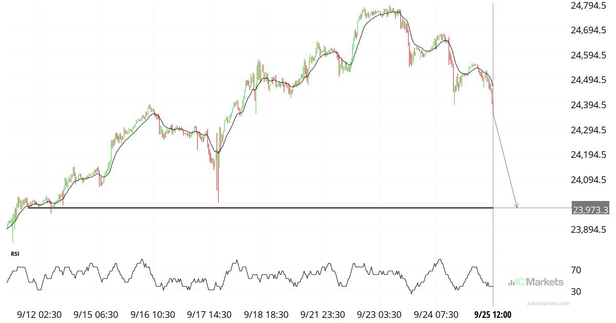 يقترب من مستوى الدعم عند 23,973.3 المحدد في 9/25 12:00. لا يزال هذا النمط قيد التشكّل. توقعات بحركة سعرية هبوطية محتملة نحو مستوى الدعم 23,973.3 خلال الـ 2 أيام القادمة. تحذير من المخاطر: ينطوي التداول في الأوراق المالية على مخاطر كبيرة. قد تتقلب الأسعار وقد تفقد الأوراق المالية قيمتها بالكامل. قد تتجاوز الخسائر قيمة الودائع. […]
