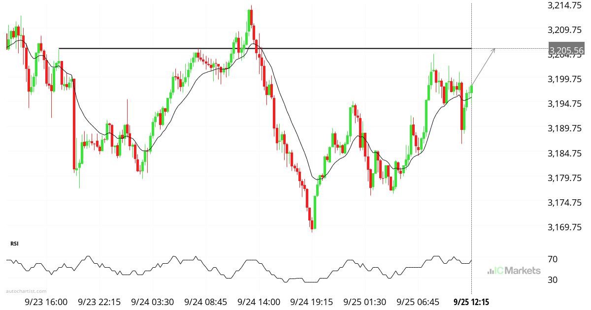 يقترب من مستوى المقاومة عند 3,205.56 المحدد في 9/25 12:15. لا يزال هذا النمط قيد التشكّل. توقعات بحركة سعرية صعودية محتملة نحو مستوى المقاومة 3,205.56 خلال الـ 9 ساعات القادمة. تحذير من المخاطر: ينطوي التداول في الأوراق المالية على مخاطر كبيرة. قد تتقلب الأسعار وقد تفقد الأوراق المالية قيمتها بالكامل. قد تتجاوز الخسائر قيمة الودائع. […]