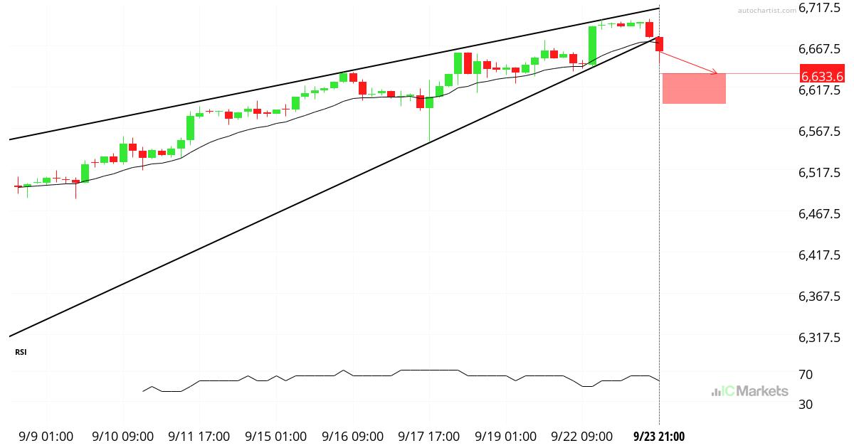 اخترق الوتد الصاعد خط الدعم في 9/23 21:00. من المتوقع حدوث حركة سعرية هبوطية خلال الـ 1 يوم القادمة نحو 6,633.6. تحذير من المخاطر: ينطوي التداول في الأوراق المالية على مخاطر كبيرة. قد تتقلب الأسعار وقد تفقد الأوراق المالية قيمتها بالكامل. قد تتجاوز الخسائر قيمة الودائع. هذه المنتجات معقدة وتتطلب معرفة مناسبة.