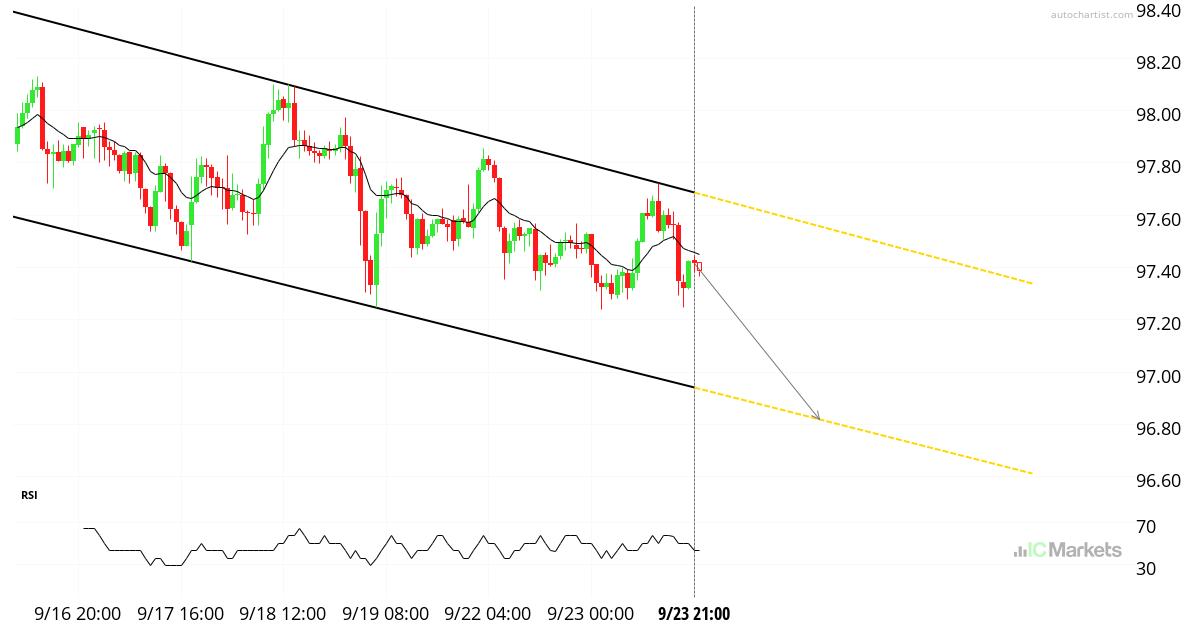تم تحديد القناة الهابطة في 9/23 21:00. لا يزال هذا النمط قيد التشكّل. توقعات بحركة سعرية هبوطية محتملة نحو مستوى الدعم 96.82 خلال الـ 1 يوم القادمة. تحذير من المخاطر: ينطوي التداول في الأوراق المالية على مخاطر كبيرة. قد تتقلب الأسعار وقد تفقد الأوراق المالية قيمتها بالكامل. قد تتجاوز الخسائر قيمة الودائع. هذه المنتجات معقدة […]