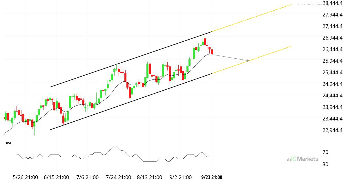 تم تحديد القناة الصاعدة في 9/23 21:00. لا يزال هذا النمط قيد التشكّل. توقعات بحركة سعرية هبوطية محتملة نحو مستوى الدعم 25,896.1 خلال الـ 21 أيام القادمة. تحذير من المخاطر: ينطوي التداول في الأوراق المالية على مخاطر كبيرة. قد تتقلب الأسعار وقد تفقد الأوراق المالية قيمتها بالكامل. قد تتجاوز الخسائر قيمة الودائع. هذه المنتجات معقدة […]