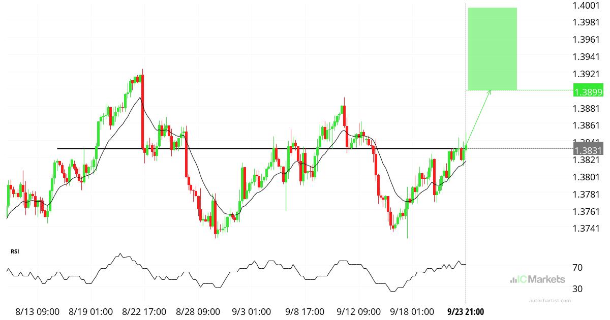 اخترق السعر مستوى المقاومة عند 1.3831 في 9/23 21:00. توقعات بحركة سعرية صعودية محتملة خلال الـ 6 أيام القادمة نحو 1.3899. تحذير من المخاطر: ينطوي التداول في الأوراق المالية على مخاطر كبيرة. قد تتقلب الأسعار وقد تفقد الأوراق المالية قيمتها بالكامل. قد تتجاوز الخسائر قيمة الودائع. هذه المنتجات معقدة وتتطلب معرفة مناسبة.
