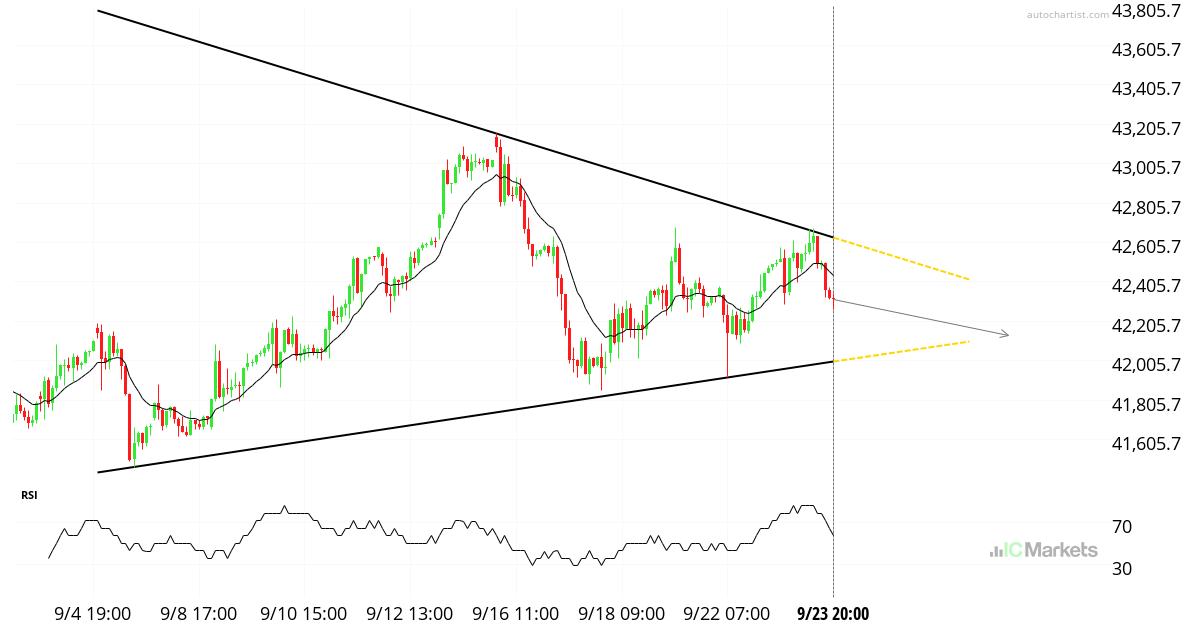 สามเหลี่ยม ถูกระบุที่ 9/23 20:00 รูปแบบนี้กำลังอยู่ระหว่างกระบวนการสร้างตัว การเคลื่อนไหวของราคาแบบหมีไปยังแนวรับ 42,133.8 ภายใน 2 วัน ถัดไป การซื้อขายหลักทรัพย์มีความเสี่ยงสูง ราคาหลักทรัพย์อาจมีความผันผวนและอาจสูญเสียมูลค่าได้ นักลงทุนอาจสูญเสียเงินลงทุนเกินกว่าที่ฝากไว้ ผลิตภัณฑ์เหล่านี้มีความซับซ้อนและต้องใช้ความรู้ความเข้าใจอย่างเหมาะสมก่อนการลงทุน