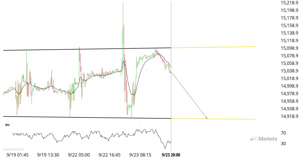 تم تحديد نموذج الرأس والكتفين في 9/23 20:00. لا يزال هذا النمط قيد التشكّل. توقعات بحركة سعرية هبوطية محتملة نحو مستوى الدعم 14,909.6641 خلال الـ 17 ساعات القادمة. تحذير من المخاطر: ينطوي التداول في الأوراق المالية على مخاطر كبيرة. قد تتقلب الأسعار وقد تفقد الأوراق المالية قيمتها بالكامل. قد تتجاوز الخسائر قيمة الودائع. هذه المنتجات […]