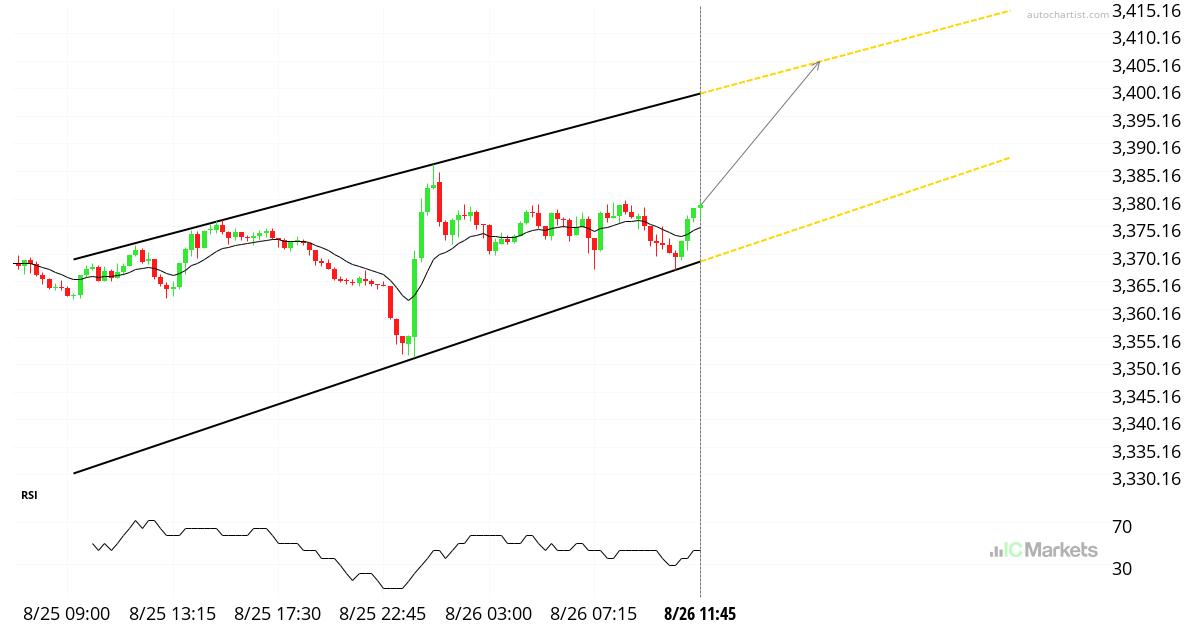 تم تحديد قناة صاعدة في 8/26 11:45. لا يزال هذا النمط في طور التشكّل. من المحتمل حدوث حركة سعرية صعودية نحو مستوى المقاومة 3,405.08 خلال الـ 6 ساعات القادمة. ينطوي تداول المشتقات المالية على مخاطر عالية وقد يؤدي إلى خسارة رأس المال