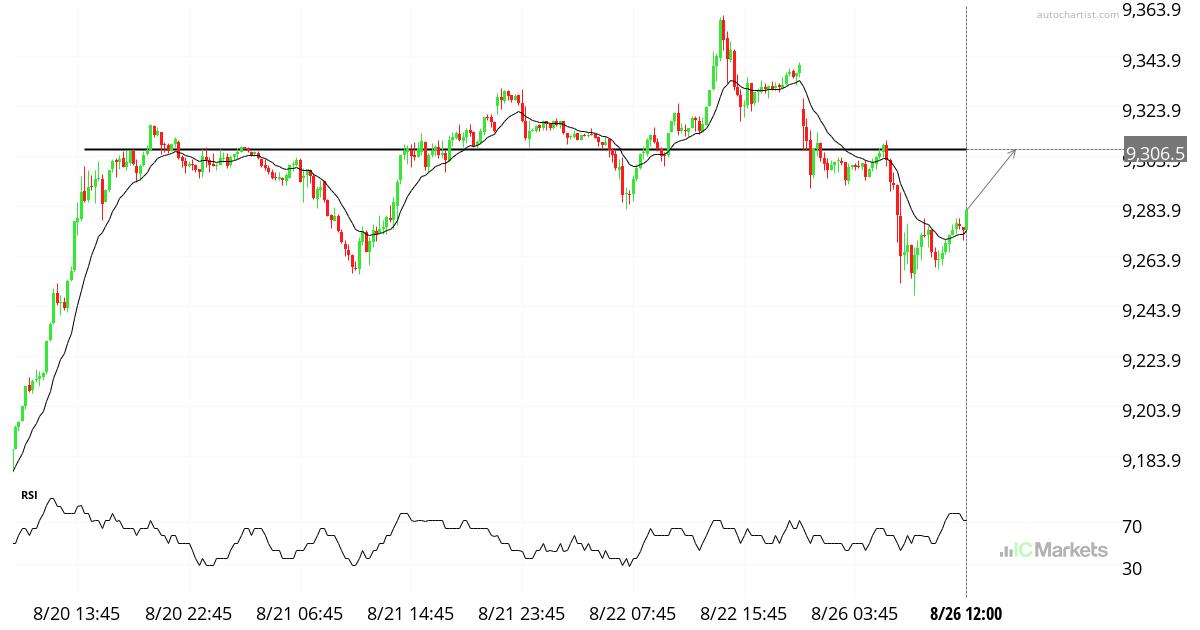 يقترب من مستوى مقاومة عند 9,306.5 الذي تم تحديده في 8/26 12:00. لا يزال هذا النمط في طور التشكّل. توقعات بامكانية صعود السعر الى اعلى قيمة متوقعة 15 ساعات في الفترة القادمة 9,306.5. ينطوي تداول المشتقات المالية على مخاطر عالية وقد يؤدي إلى خسارة رأس المال