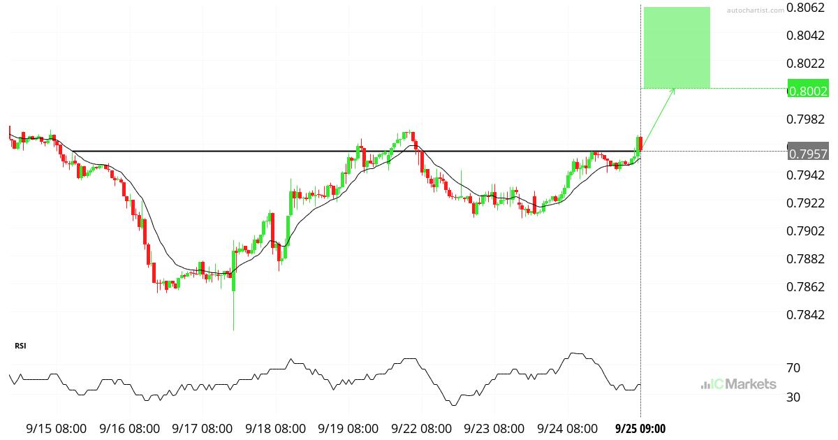 اخترق السعر مستوى المقاومة عند 0.7957 في 9/25 09:00. توقعات بحركة سعرية صعودية محتملة خلال الـ 1 يوم القادمة نحو 0.8002. تحذير من المخاطر: ينطوي التداول في الأوراق المالية على مخاطر كبيرة. قد تتقلب الأسعار وقد تفقد الأوراق المالية قيمتها بالكامل. قد تتجاوز الخسائر قيمة الودائع. هذه المنتجات معقدة وتتطلب معرفة مناسبة.