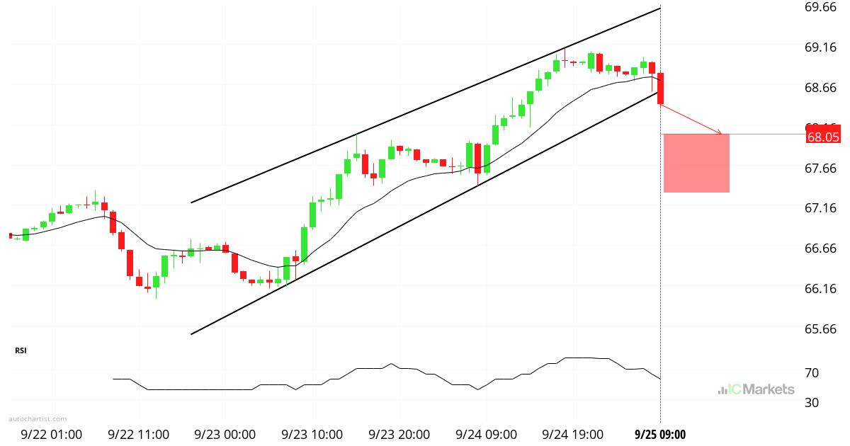 اخترق القناة الصاعدة خط الدعم في 9/25 09:00. من المتوقع حدوث حركة سعرية هبوطية خلال الـ 12 ساعات القادمة نحو 68.05. تحذير من المخاطر: ينطوي التداول في الأوراق المالية على مخاطر كبيرة. قد تتقلب الأسعار وقد تفقد الأوراق المالية قيمتها بالكامل. قد تتجاوز الخسائر قيمة الودائع. هذه المنتجات معقدة وتتطلب معرفة مناسبة.