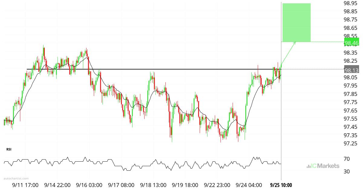 اخترق السعر مستوى المقاومة عند 98.13 في 9/25 10:00. توقعات بحركة سعرية صعودية محتملة خلال الـ 2 أيام القادمة نحو 98.46. تحذير من المخاطر: ينطوي التداول في الأوراق المالية على مخاطر كبيرة. قد تتقلب الأسعار وقد تفقد الأوراق المالية قيمتها بالكامل. قد تتجاوز الخسائر قيمة الودائع. هذه المنتجات معقدة وتتطلب معرفة مناسبة.