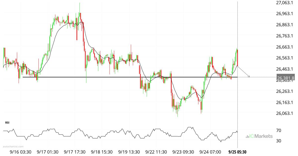 يقترب من مستوى الدعم عند 26,381.8 المحدد في 9/25 05:30. لا يزال هذا النمط قيد التشكّل. توقعات بحركة سعرية هبوطية محتملة نحو مستوى الدعم 26,381.8 خلال الـ 1 يوم القادمة. تحذير من المخاطر: ينطوي التداول في الأوراق المالية على مخاطر كبيرة. قد تتقلب الأسعار وقد تفقد الأوراق المالية قيمتها بالكامل. قد تتجاوز الخسائر قيمة الودائع. […]