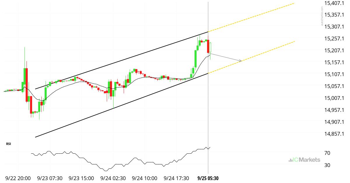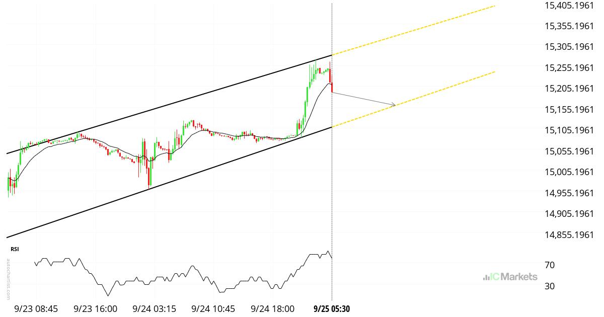تم تحديد القناة الصاعدة في 9/25 05:30. لا يزال هذا النمط قيد التشكّل. توقعات بحركة سعرية هبوطية محتملة نحو مستوى الدعم 15,159.5 خلال الـ 9 ساعات القادمة. تحذير من المخاطر: ينطوي التداول في الأوراق المالية على مخاطر كبيرة. قد تتقلب الأسعار وقد تفقد الأوراق المالية قيمتها بالكامل. قد تتجاوز الخسائر قيمة الودائع. هذه المنتجات معقدة […]