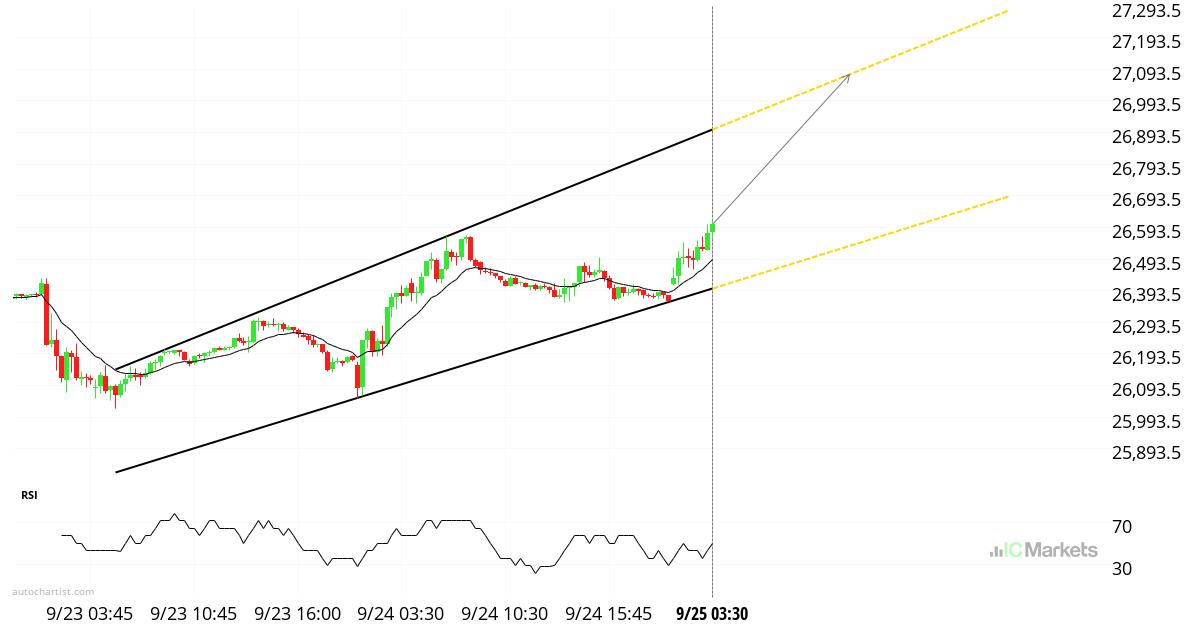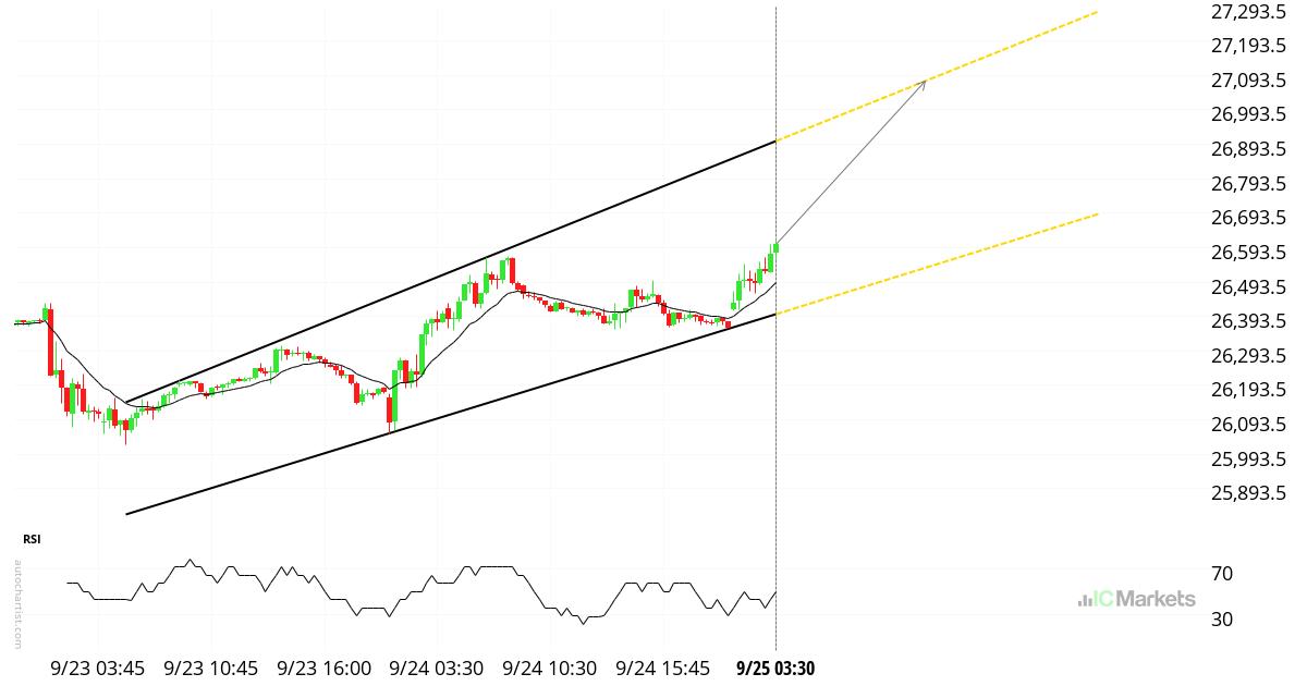 تم تحديد القناة الصاعدة في 9/25 03:30. لا يزال هذا النمط قيد التشكّل. توقعات بحركة سعرية صعودية محتملة نحو مستوى المقاومة 27,076.0 خلال الـ 8 ساعات القادمة. تحذير من المخاطر: ينطوي التداول في الأوراق المالية على مخاطر كبيرة. قد تتقلب الأسعار وقد تفقد الأوراق المالية قيمتها بالكامل. قد تتجاوز الخسائر قيمة الودائع. هذه المنتجات معقدة […]
