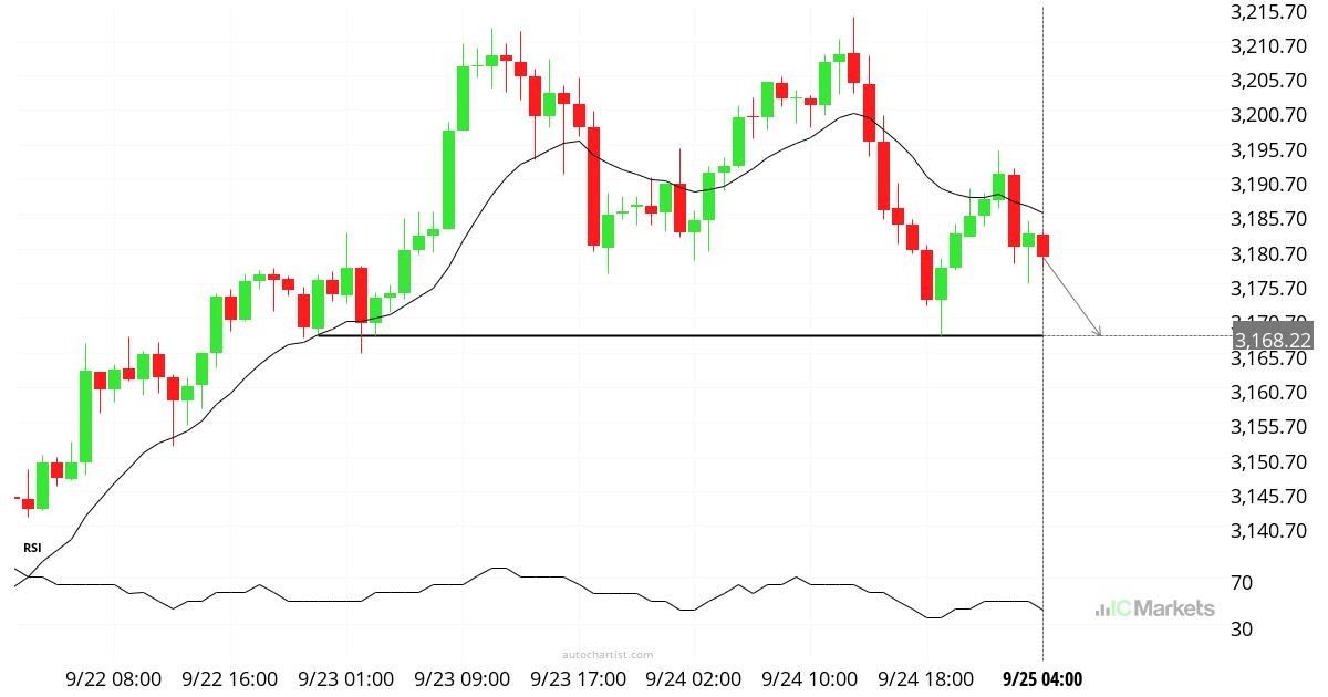 يقترب من مستوى الدعم عند 3,168.22 المحدد في 9/25 04:00. لا يزال هذا النمط قيد التشكّل. توقعات بحركة سعرية هبوطية محتملة نحو مستوى الدعم 3,168.22 خلال الـ 10 ساعات القادمة. تحذير من المخاطر: ينطوي التداول في الأوراق المالية على مخاطر كبيرة. قد تتقلب الأسعار وقد تفقد الأوراق المالية قيمتها بالكامل. قد تتجاوز الخسائر قيمة الودائع. […]