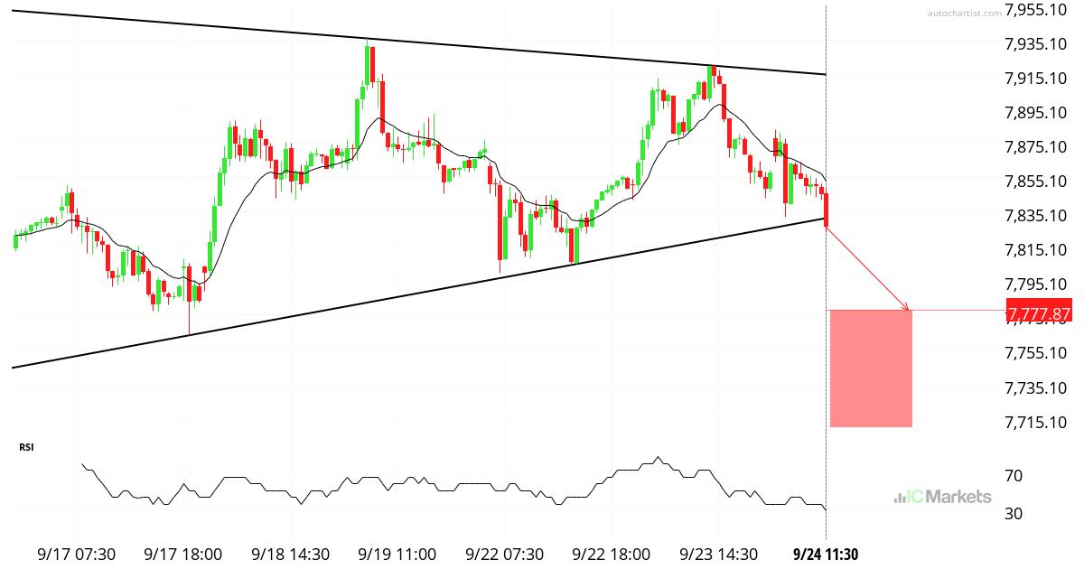 اخترق مثلث خط الدعم في 9/24 11:30. من المتوقع حدوث حركة سعرية هبوطية خلال الـ 19 ساعات القادمة نحو 7,777.87. تحذير من المخاطر: ينطوي التداول في الأوراق المالية على مخاطر كبيرة. قد تتقلب الأسعار وقد تفقد الأوراق المالية قيمتها بالكامل. قد تتجاوز الخسائر قيمة الودائع. هذه المنتجات معقدة وتتطلب معرفة مناسبة.