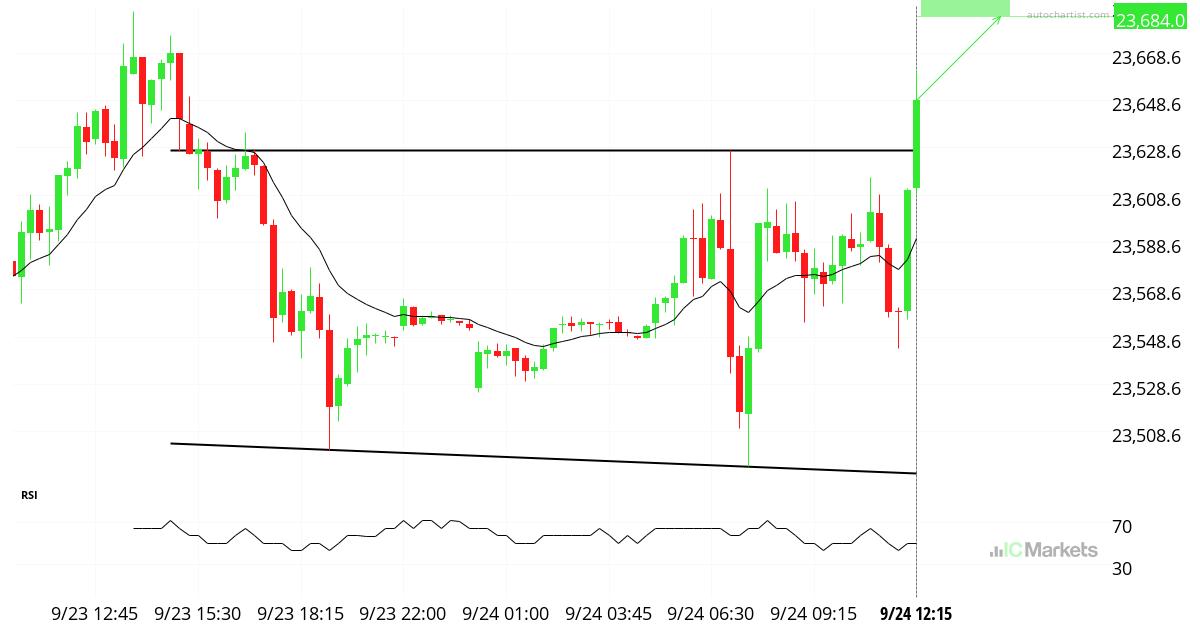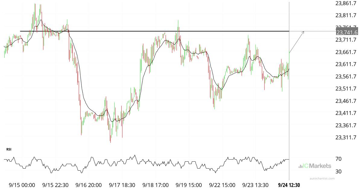 يقترب من مستوى المقاومة عند 23,741.6 المحدد في 9/24 12:30. لا يزال هذا النمط قيد التشكّل. توقعات بحركة سعرية صعودية محتملة نحو مستوى المقاومة 23,741.6 خلال الـ 1 يوم القادمة. تحذير من المخاطر: ينطوي التداول في الأوراق المالية على مخاطر كبيرة. قد تتقلب الأسعار وقد تفقد الأوراق المالية قيمتها بالكامل. قد تتجاوز الخسائر قيمة الودائع. […]