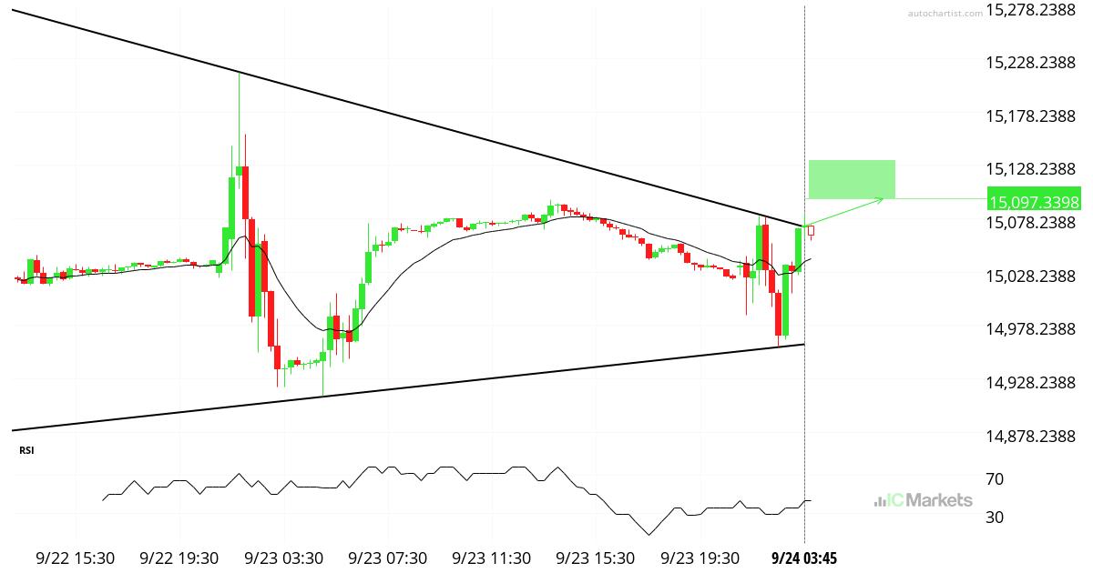 اخترق مثلث خط المقاومة في 9/24 03:45. من المتوقع حدوث حركة سعرية صعودية خلال الـ 6 ساعات القادمة نحو 15,097.3398. تحذير من المخاطر: ينطوي التداول في الأوراق المالية على مخاطر كبيرة. قد تتقلب الأسعار وقد تفقد الأوراق المالية قيمتها بالكامل. قد تتجاوز الخسائر قيمة الودائع. هذه المنتجات معقدة وتتطلب معرفة مناسبة.