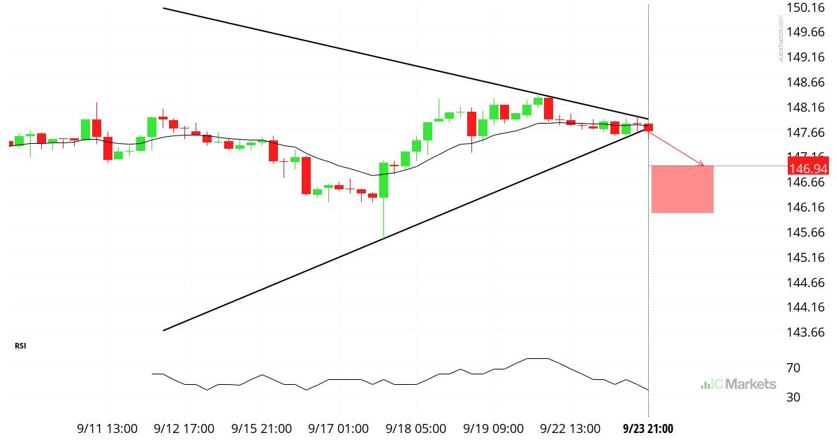 اخترق مثلث خط الدعم في 9/23 21:00. من المتوقع حدوث حركة سعرية هبوطية خلال الـ 1 يوم القادمة نحو 146.94. تحذير من المخاطر: ينطوي التداول في الأوراق المالية على مخاطر كبيرة. قد تتقلب الأسعار وقد تفقد الأوراق المالية قيمتها بالكامل. قد تتجاوز الخسائر قيمة الودائع. هذه المنتجات معقدة وتتطلب معرفة مناسبة.