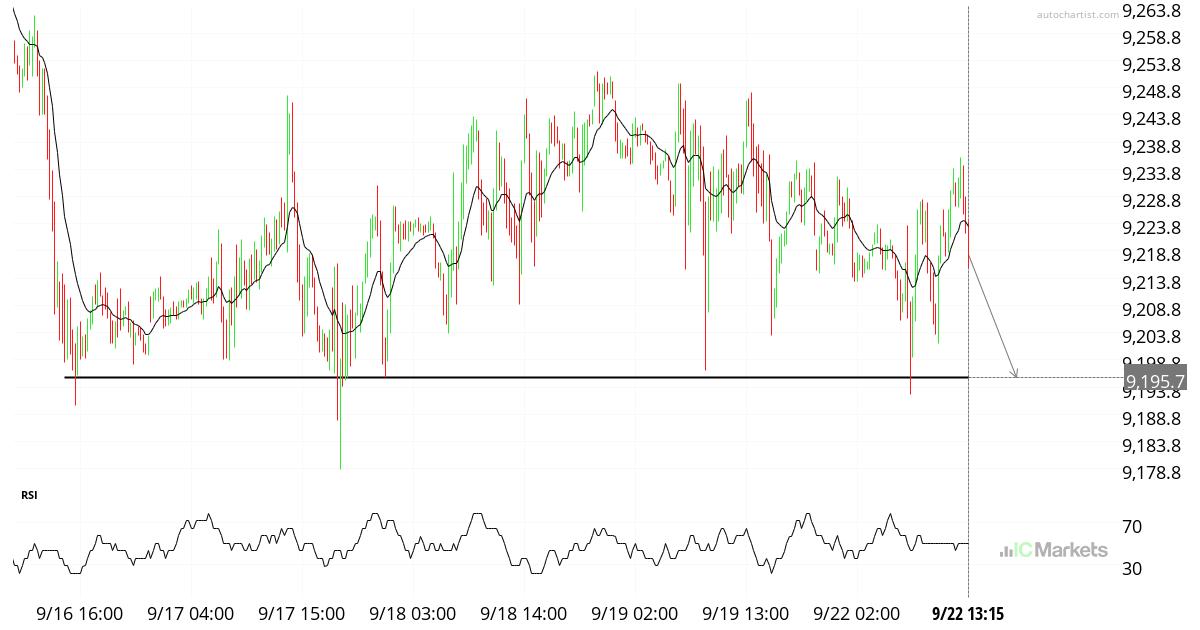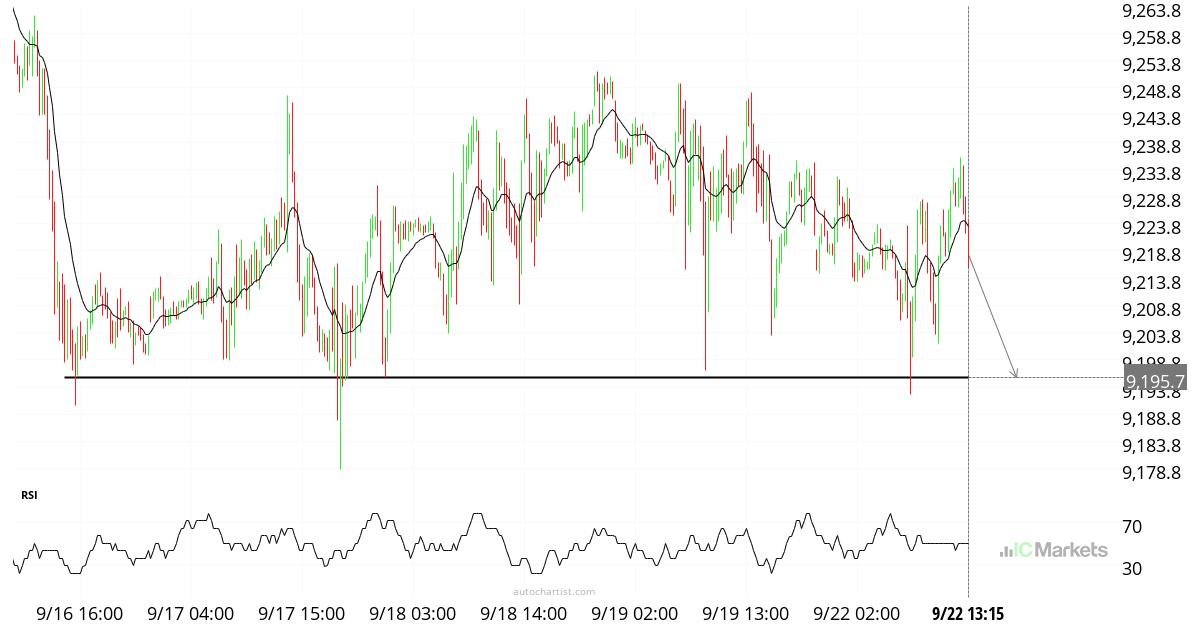 กำลังเคลื่อนไปที่ระดับ แนวรับ ของ 9,195.6 ตรวจพบที่ 9/22 13:15 รูปแบบนี้กำลังอยู่ระหว่างการฟอร์มตัว มีโอกาสเกิดการเคลื่อนตัวของราคาแบบ bearish ไปยังแนวรับ 9,195.6 ภายใน 21 ชั่วโมง ต่อจากนี้ การซื้อขายหลักทรัพย์มีความเสี่ยงสูง ราคาหลักทรัพย์อาจมีความผันผวนและอาจสูญเสียมูลค่าได้ นักลงทุนอาจสูญเสียเงินลงทุนเกินกว่าที่ฝากไว้ ผลิตภัณฑ์เหล่านี้มีความซับซ้อนและต้องใช้ความรู้ความเข้าใจอย่างเหมาะสมก่อนการลงทุน