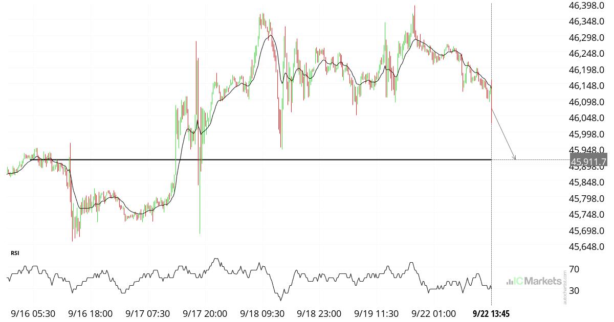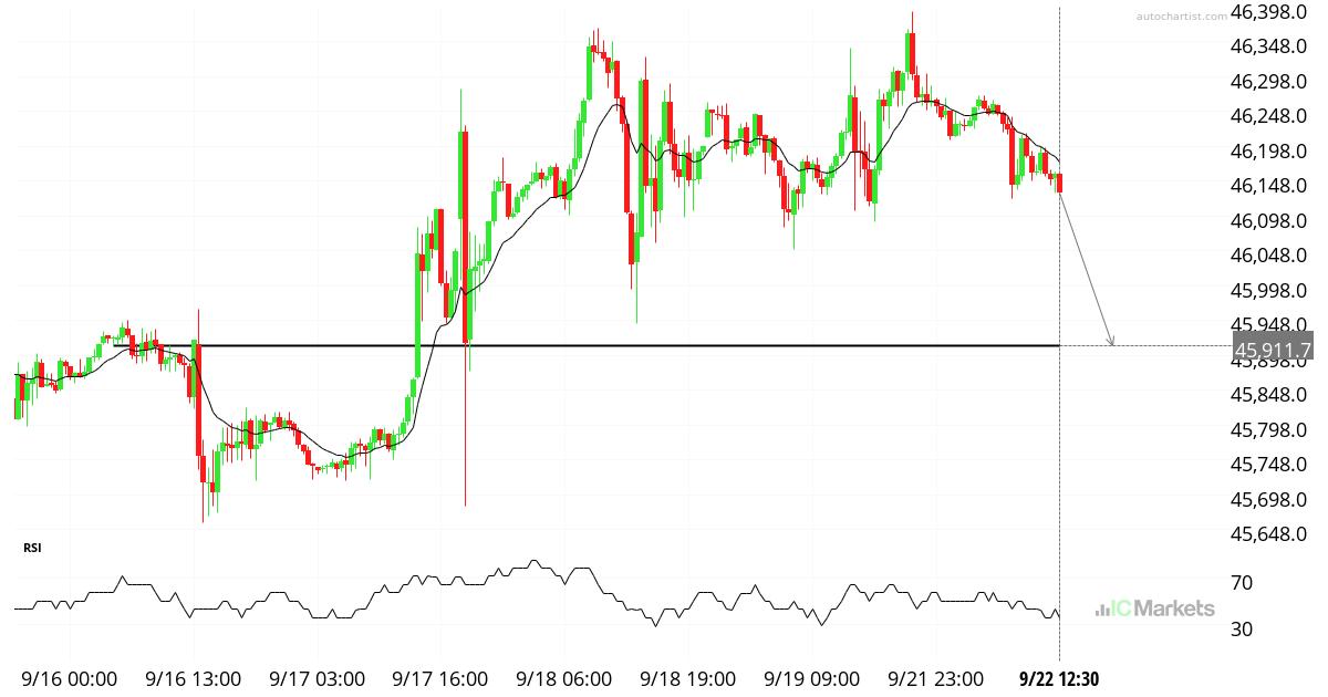 يقترب من مستوى الدعم عند 45,911.7 المحدد في 9/22 12:30. لا يزال هذا النمط قيد التشكّل. توقعات بحركة سعرية هبوطية محتملة نحو مستوى الدعم 45,911.7 خلال الـ 1 يوم القادمة. تحذير من المخاطر: ينطوي التداول في الأوراق المالية على مخاطر كبيرة. قد تتقلب الأسعار وقد تفقد الأوراق المالية قيمتها بالكامل. قد تتجاوز الخسائر قيمة الودائع. […]