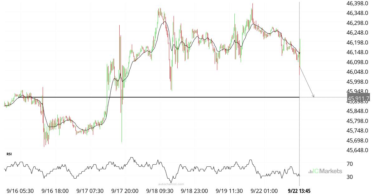 يقترب من مستوى الدعم عند 45,911.7 المحدد في 9/22 13:45. لا يزال هذا النمط قيد التشكّل. توقعات بحركة سعرية هبوطية محتملة نحو مستوى الدعم 45,911.7 خلال الـ 1 يوم القادمة. تحذير من المخاطر: ينطوي التداول في الأوراق المالية على مخاطر كبيرة. قد تتقلب الأسعار وقد تفقد الأوراق المالية قيمتها بالكامل. قد تتجاوز الخسائر قيمة الودائع. […]