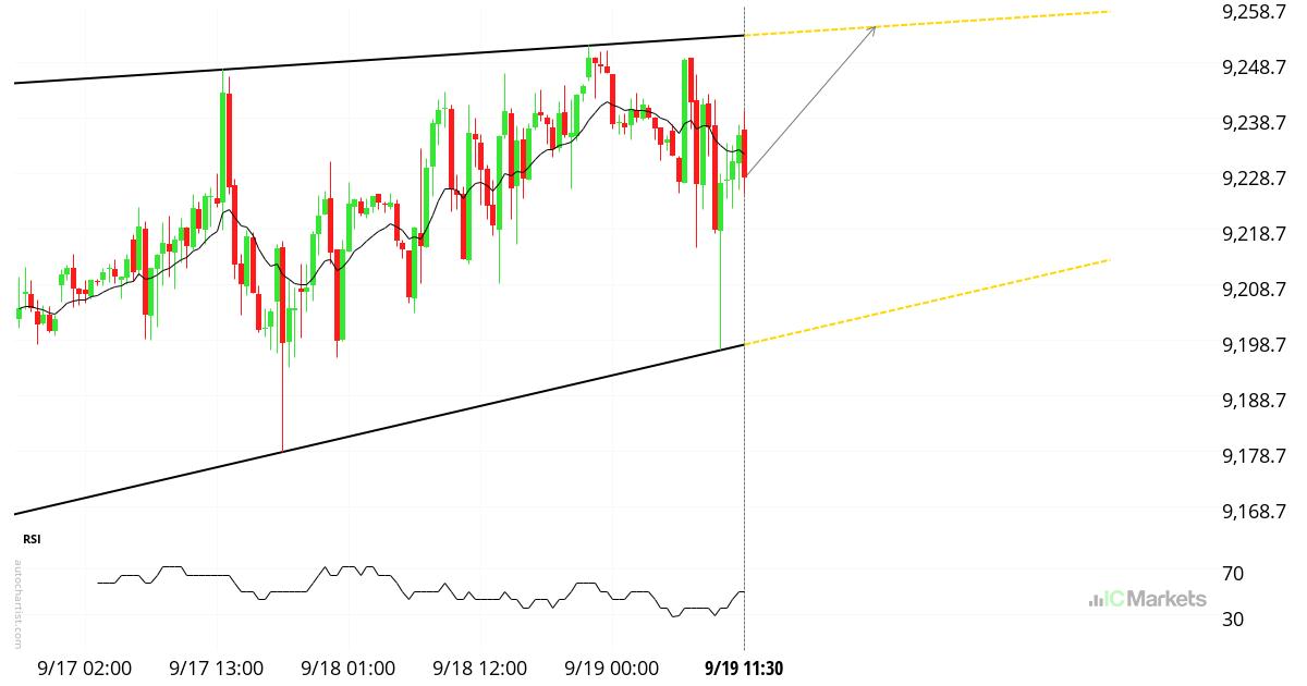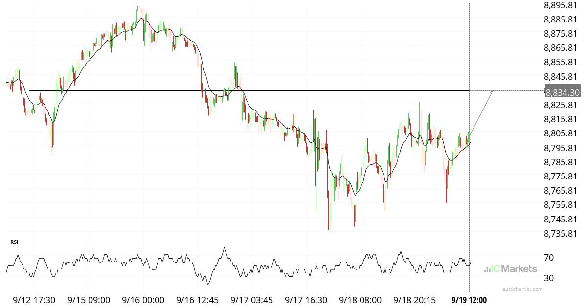 يقترب من مستوى المقاومة عند 8,834.30 المحدد في 9/19 12:00. لا يزال هذا النمط قيد التشكّل. توقعات بحركة سعرية صعودية محتملة نحو مستوى المقاومة 8,834.30 خلال الـ 1 يوم القادمة. تحذير من المخاطر: ينطوي التداول في الأوراق المالية على مخاطر كبيرة. قد تتقلب الأسعار وقد تفقد الأوراق المالية قيمتها بالكامل. قد تتجاوز الخسائر قيمة الودائع. […]