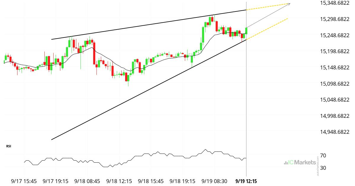 تم تحديد الوتد الصاعد في 9/19 12:15. لا يزال هذا النمط قيد التشكّل. توقعات بحركة سعرية صعودية محتملة نحو مستوى المقاومة 15,344.1044 خلال الـ 6 ساعات القادمة. تحذير من المخاطر: ينطوي التداول في الأوراق المالية على مخاطر كبيرة. قد تتقلب الأسعار وقد تفقد الأوراق المالية قيمتها بالكامل. قد تتجاوز الخسائر قيمة الودائع. هذه المنتجات معقدة […]