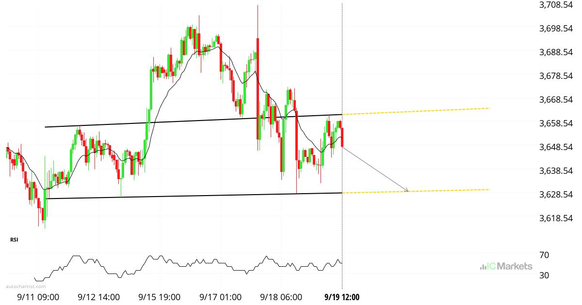 يقترب من مستوى الدعم عند 3,630.58 المحدد في 9/19 11:30. لا يزال هذا النمط قيد التشكّل. توقعات بحركة سعرية هبوطية محتملة نحو مستوى الدعم 3,630.58 خلال الـ 1 يوم القادمة. تحذير من المخاطر: ينطوي التداول في الأوراق المالية على مخاطر كبيرة. قد تتقلب الأسعار وقد تفقد الأوراق المالية قيمتها بالكامل. قد تتجاوز الخسائر قيمة الودائع. […]